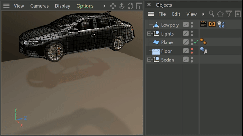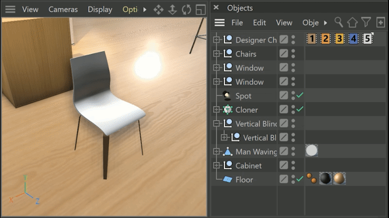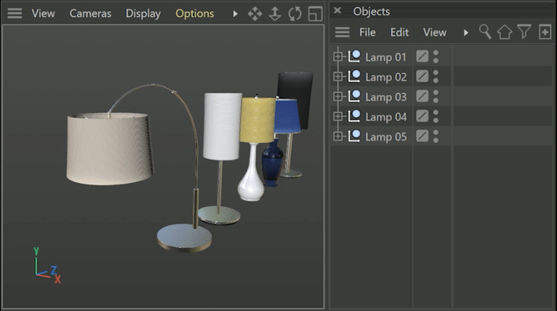 Rapid Recall of different options: Keep your Object Manager clean, or for when the client is hanging over your shoulder and can’t decide which lamp they like better…
