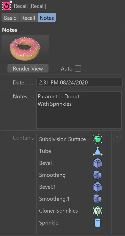 Keep your Object Manager nice and clean by storing backup copies, iterations, and experiments of objects, rigs, and models stored directly in your Recall tags.